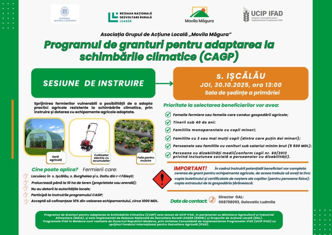 𝑷𝒓𝒐𝒈𝒓𝒂𝒎𝒖𝒍 𝒅𝒆 𝑮𝒓𝒂𝒏𝒕𝒖𝒓𝒊 𝒑𝒆𝒏𝒕𝒓𝒖 𝑨𝒅𝒂𝒑𝒕𝒂𝒓𝒆𝒂 𝒍𝒂 𝑺𝒄𝒉𝒊𝒎𝒃𝒂̆𝒓𝒊𝒍𝒆 𝑪𝒍𝒊𝒎𝒂𝒕𝒊𝒄𝒆 (𝑪𝑨𝑮𝑷) 𝒆𝒔𝒕𝒆 𝒍𝒂𝒏𝒔𝒂𝒕 𝒅𝒆 𝑼𝑪𝑰𝑷 𝑰𝑭𝑨𝑫, 𝒊̂𝒏 𝒑𝒂𝒓𝒕𝒆𝒏𝒆𝒓𝒊𝒂𝒕 𝒄𝒖 𝑴𝒊𝒏𝒊𝒔𝒕𝒆𝒓𝒖𝒍 𝑨𝒈𝒓𝒊𝒄𝒖𝒍𝒕𝒖𝒓𝒊𝒊 𝒔̦𝒊 𝑰𝒏𝒅𝒖𝒔𝒕𝒓𝒊𝒆𝒊 𝑨𝒍𝒊𝒎𝒆𝒏𝒕𝒂𝒓𝒆 (𝑴𝑨𝑰𝑨), 𝒔̦𝒊 𝒆𝒔𝒕𝒆 𝒊𝒎𝒑𝒍𝒆𝒎𝒆𝒏𝒕𝒂𝒕 𝒅𝒆 𝑹𝒆𝒕̦𝒆𝒂𝒖𝒂 𝑵𝒂𝒕̦𝒊𝒐𝒏𝒂𝒍𝒂̆ 𝒅𝒆 𝑫𝒆𝒛𝒗𝒐𝒍𝒕𝒂𝒓𝒆 𝑹𝒖𝒓𝒂𝒍𝒂̆ 𝑳𝑬𝑨𝑫𝑬𝑹 (𝑹𝑵𝑫𝑹𝑳) 𝒔̦𝒊 𝑮𝒓𝒖𝒑𝒖𝒓𝒊𝒍𝒆 𝒅𝒆 𝑨𝒄𝒕̦𝒊𝒖𝒏𝒆 𝑳𝒐𝒄𝒂𝒍𝒂̆ (𝑮𝑨𝑳). 𝑷𝒓𝒐𝒈𝒓𝒂𝒎𝒆𝒍𝒆 𝑰𝑭𝑨𝑫 𝒊̂𝒏 𝑴𝒐𝒍𝒅𝒐𝒗𝒂 𝒔𝒖𝒏𝒕 𝒓𝒆𝒂𝒍𝒊𝒛𝒂𝒕𝒆 𝒅𝒆 𝑮𝒖𝒗𝒆𝒓𝒏𝒖𝒍 𝑹𝒆𝒑𝒖𝒃𝒍𝒊𝒄𝒊𝒊 𝑴𝒐𝒍𝒅𝒐𝒗𝒂, 𝒑𝒓𝒊𝒏 𝑼𝒏𝒊𝒕𝒂𝒕𝒆𝒂 𝑪𝒐𝒏𝒔𝒐𝒍𝒊𝒅𝒂𝒕𝒂̆ 𝒅𝒆 𝑰𝒎𝒑𝒍𝒆𝒎𝒆𝒏𝒕𝒂𝒓𝒆𝒂 𝑷𝒓𝒐𝒈𝒓𝒂𝒎𝒆𝒍𝒐𝒓 𝑰𝑭𝑨𝑫 (𝑼𝑪𝑰𝑷 𝑰𝑭𝑨𝑫) 𝒄𝒖 𝒔𝒑𝒓𝒊𝒋𝒊𝒏𝒖𝒍 𝑭𝒐𝒏𝒅𝒖𝒍𝒖𝒊 𝑰𝒏𝒕𝒆𝒓𝒏𝒂𝒕̦𝒊𝒐𝒏𝒂𝒍 𝒑𝒆𝒏𝒕𝒓𝒖 𝑫𝒆𝒛𝒗𝒐𝒍𝒕𝒂𝒓𝒆 𝑨𝒈𝒓𝒊𝒄𝒐𝒍𝒂̆ (𝑰𝑭𝑨𝑫).