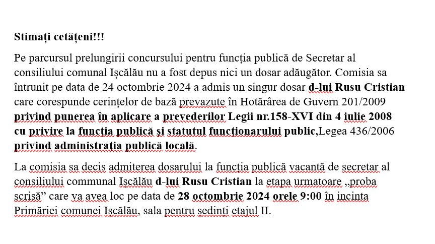 Fără categorie Rezultatele concursului ”La funcția publică vacantă de secretar al Consiliului comunal Ișcălău„ 29.10.2024 Publicat de Primaria Redactor 24 oct.